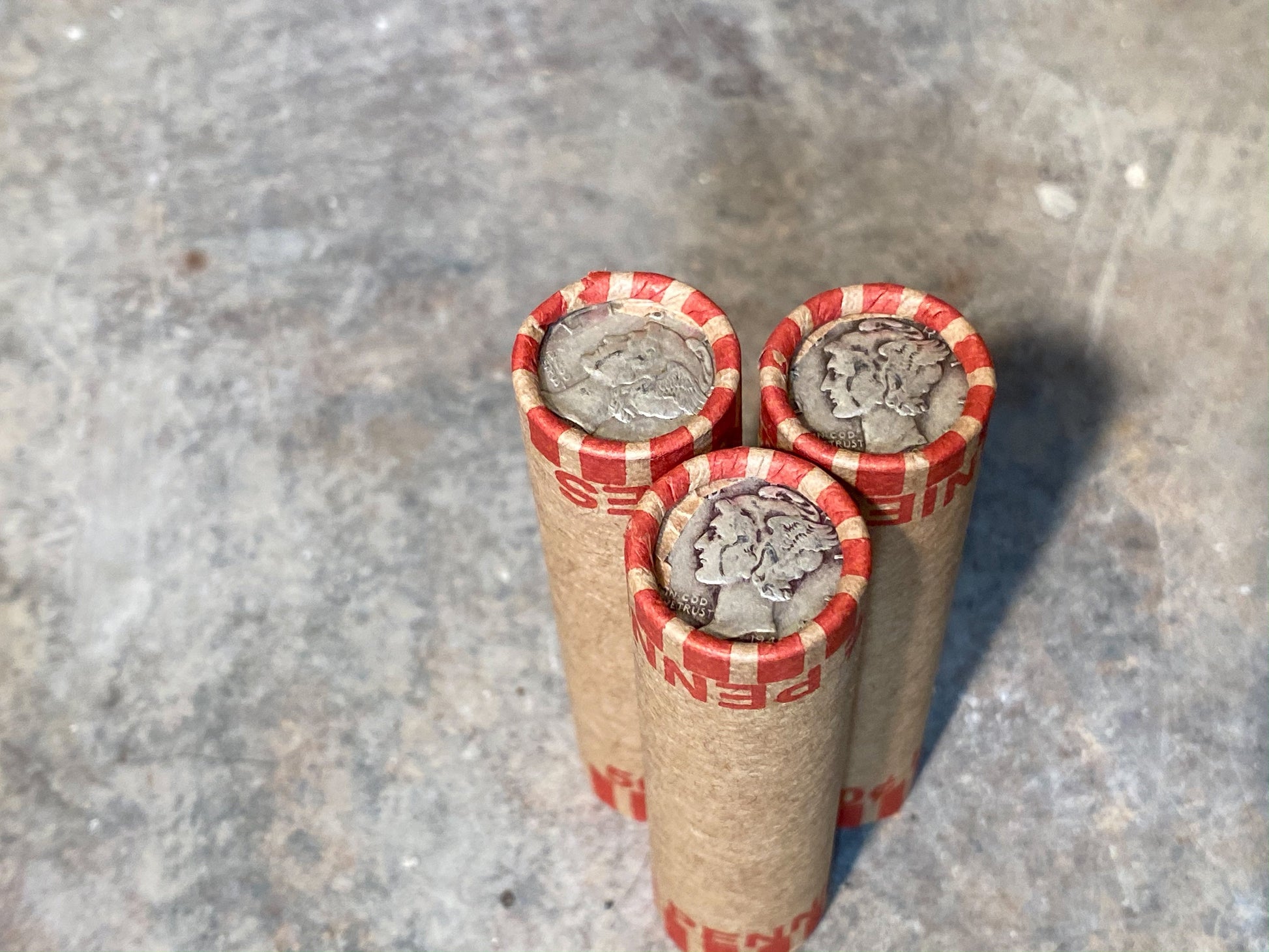 SILVER MERCURY DIME showing on old vintage unsearched old green wheat penny roll us coins estate hoard collection cent sale pennies lot